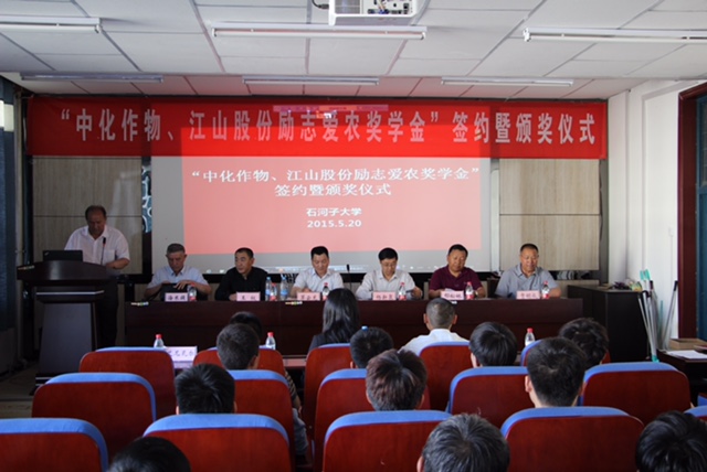 5月20日,由南通江山农药化工股份有限公司与中化作物保护品有限公司联合捐助的“中化作物、江山股份励志爱农奖学金”签约暨首次颁奖仪式在石河子大学农学院隆重举行。公司党委副书记茅云龙、中化作物副总经理王权、石河子大学校长助理杨新泉、农学院党委副书记艾尼瓦尔等校院领导以及校辅导员、学生代表参加了签约及颁奖仪式。