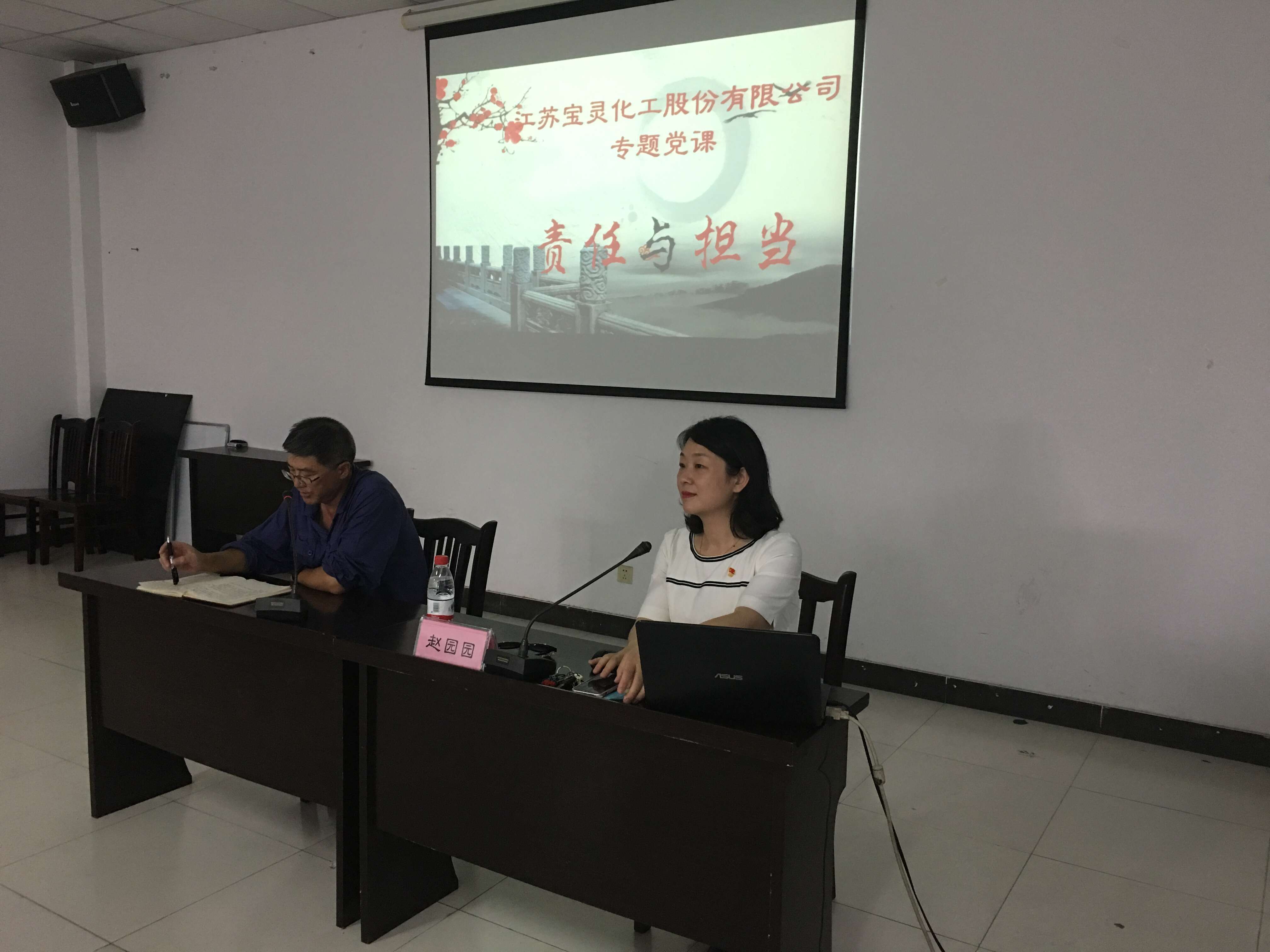 为深入学习贯彻党的十九大精神和习近平新时代中国特色社会主义思想,纪念建党 97 周年,坚定理想信念,加强党性修养,宝灵化工党委在6月底按期完成省、市委组织部《关于召开“进一步解放思想,激励新时代新担当新作为”专题组织生活会》的基础上,于7月19日下午组织全体党员干部、入党积极分子近六十人,举行了“责任与担当”专题党性教育,特邀南通市委党校赵园园博士前来公司作《责任与担当》党课辅导。7月23日的办公会上,朱文新董事长又进一步强调,全体党员干部必须立足本职本岗,做到“对待工作极端尽责,难题面前勇于负责,出现过失敢于担责”,把一个党员干部该担当的责任体现到干事创业、奋发有为的具体行动上。
