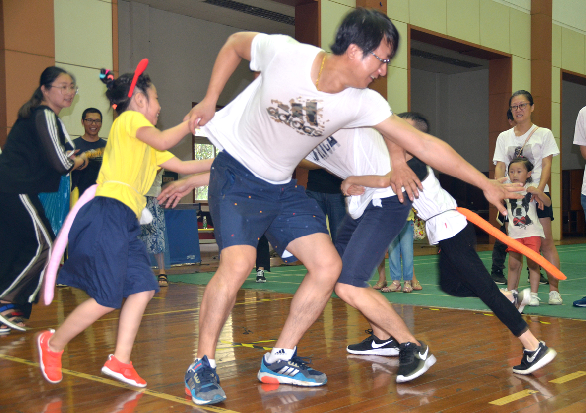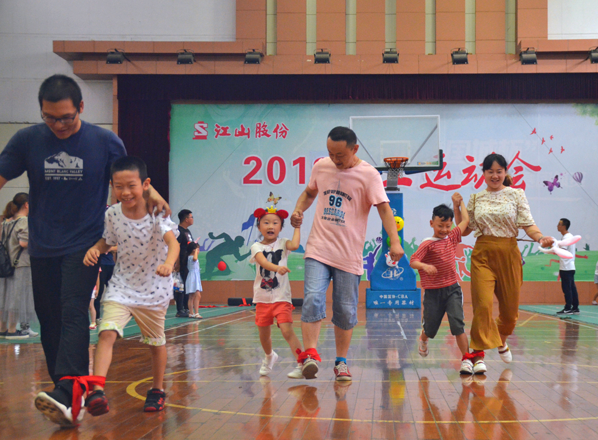 两人三足、猴子倒挂、踩石头过河、耳语传话、揪尾巴、小小纤夫……在快节奏的生活中,难得的亲子趣味运动时光让江山股份文体活动中心充满了欢声笑语。
