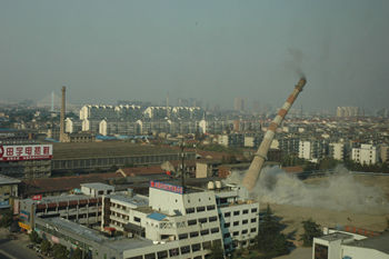 ----为全市实现“十一五”节能减排目标作出贡献 11月8日下午3点整,随着一声闷响,位于南通热电公司内一根有30年历史的烟囱,顺着设定的东南方向缓缓倒下,这标志着西城区集中供热项目最后扫尾工作顺利完成。 被爆破的烟囱高约80米,建于1980年,是由南通人自己建造的第一座高层烟囱,也是主城区最高的烟囱。去年,市委、市政府决定关停南通热电和江山热电,统一由大型供电企业集中供热、供电。两家热电厂的关停,年可节约标准煤10万吨、减排SO2约2800吨,为市区实现“十一五”节能减排目标作出重大贡献。