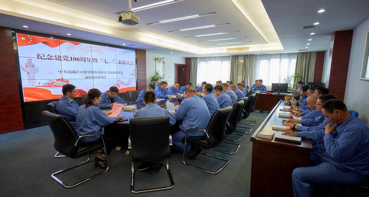 6月29日上午,南通江天化学股份有限公司党支部在公司四楼会议室召开纪念建党100周年暨七一表彰大会。支部全体党员、预备党员、发展对象和积极分子参加了此次会议。党支部书记陈梅主持会议。