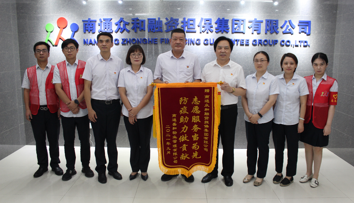 9月6日下午,南通盛和物业有限公司党支部书记兼总经理刘晓军、副总经理高晓蓉一行向众和担保送来了印有“志愿服务当为先 防疫助力做贡献”字样的锦旗,诚挚感谢众和担保在盛和物业驻启瑞广场防疫工作人手紧张的关键时期,迅速组建了一支40名青年党员、业务骨干构成的“两在两同 同心抗疫”志愿者服务队。他们利用工作之余,起早贪黑,放弃午休,不辞辛苦,坚守在防疫一线。从测温验码到秩序维护,从交通疏导到卡口管理,哪里需要就到哪里,为启瑞物业防疫工作作出了积极贡献,也得到了启瑞广场业主的点赞,充分彰显了国有企业责任担当。