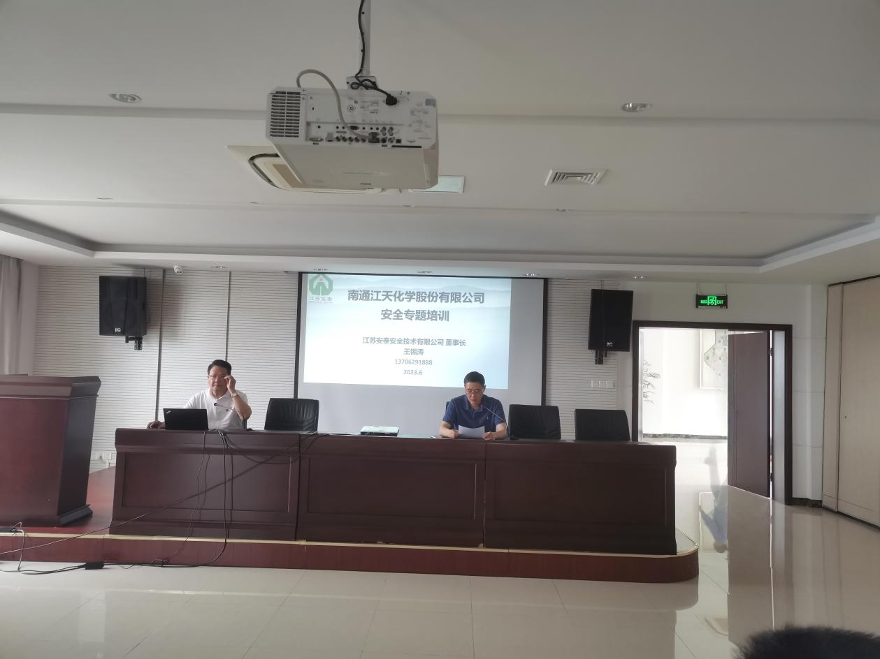 为全面贯彻习近平总书记关于安全生产的重要论述,进一步提高全员安全意识,提升岗位人员的HSE实操技能,加强承包商作业管理,6月13日下午,南通江天化学股份有限公司结合“人人讲安全、个个会应急”的安全生产月活动主题,召开了半年度主要负责人HSE培训大会。本次大会特邀江苏安泰安全技术有限公司董事长王锡涛同志为公司全体员工、承包商代表做安全生产专题培训讲座。