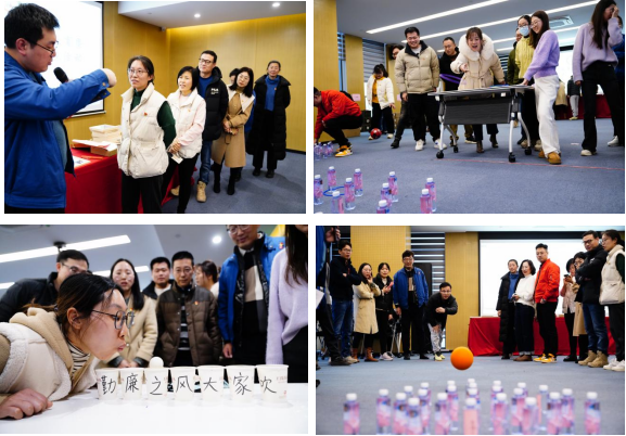 此次趣味活动以“廉”为主题,将“廉味”与“趣味”相结合,共设置答廉题、套廉环、吹廉球、树廉风、制廉品5个团体游戏项目。比赛主要通过积分制的方式进行角逐比拼,最终得出冠亚季军。活动过程中,首先进行是各队廉洁展示,在主持人的带动下,各队依次上前宣布廉洁队名、齐喊廉洁口号,在立号扬名的过程中,增强各队廉洁意识和底气。“答廉题”是指在没有事先公布题库的基础上,通过现场抽题,真实检验党员廉洁知识的掌握程度。“套廉环”则是通过投掷廉环的方式,套住“杜贪腐”,守住“我要廉”。“吹廉球”则是通过将带有“勤廉之风大家吹”字样纸杯中的小球从一边吹到另一边,寓意人人行动起来,将勤廉之风吹向工作生活的各个方面,让廉洁意识入脑入心。“树廉风”则是通过参与者用手抛或地滚球的方式,撞倒贴着写着“四风、歪风”等问题的瓶子,每倒下一个瓶子,则认定为树一次廉风,该环节旨在提醒广大职工要端正工作作风,坚决杜绝四风、歪风等问题,提高自我要求。“制廉品”则是通过手工diy制作廉画的方式,宣传廉洁文化,在动手制作间,将作品中深刻的廉洁寓意融入职工心田,时刻提醒党员干部廉洁从业。