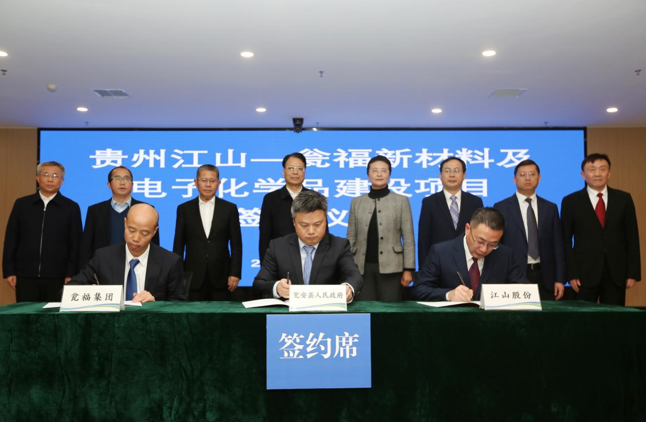 1月27日晚,贵州江山—瓮福新材料及电子化学品项目签约仪式在贵州磷化完美体育app官网入口举行,南通江山农药化工股份有限公司与瓮安县人民政府、瓮福(完美体育app官网入口)有限责任公司三方签订投资协议,打造磷化工循环一体化产业链项目。