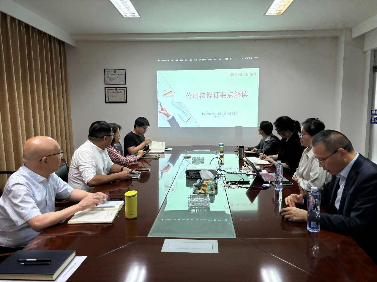 为进一步提高依法治企能力,增强公司员工的法律意识,精准把握和主动适应新《公司法》,推进公司合规经营管理工作迈上新台阶,公司于5月27日下午组织开展了《公司法修订要点解读》培训活动,公司全体员工参加了培训活动。 公司法律顾问单位盈科律师事务所汪秋语律师为主讲人,从公司法的修订历程、总则部分修订要点、有限责任公司的修订内容等几个方面进行了详细讲解,并就大家现场提出的问题进行了深入的交流。 通过此次培训活动,促进了公司干部职工对新《公司法》的深入理解,加深了员工对公司治理及管理要求的理解和认识,为今后工作中更好的防范法律风险,保障公司利益,推动公司稳步发展起到了重要的作用。