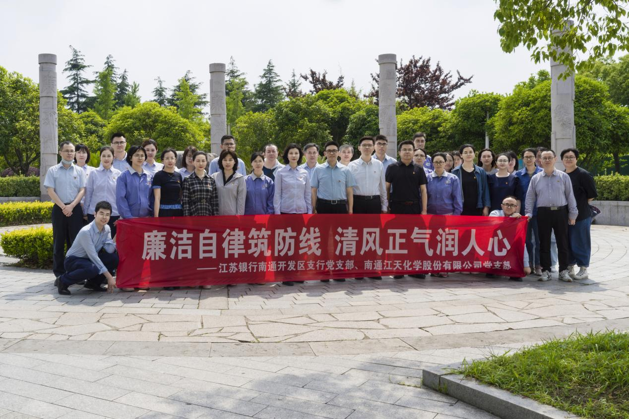 5月22日下午,江天化学党支部与江苏银行南通开发区支行党支部携手共赴南通廉洁文化广场,开展“廉洁自律筑防线 清风正气润人心”主题党日共建活动。江天化学支部书记、副总经理张永锋,支部副书记、副总经理沙晓东,支部委员、副总经理史彬,江苏银行南通开发区支行党支部书记、行长孙晴等出席活动。